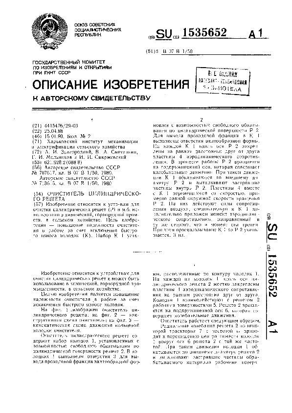 Очиститель цилиндрического решета / Завгородний А. И., Сметанкин В. А., Мельников Г. И., Свиржевский И. И.; заявитель: Харьковский институт механизации и электрификации сельского хозяйства // Описания изобретений (ретрофонд) / Комитет по патентам и товарным знакам России. – М., 2003. – 1990, № 1. — (Патенты России). — Загл. с титул. экрана. — Поисковая система: MIMOSA GTI. — Систем. требования: Acrobat Reader. — Режим доступа: ftp://smolensklib.ru/bd/patent_ru/pt1535652.pdf. — <URL:ftp://smolensklib.ru/bd/patent_ru/pt1535652.pdf>.