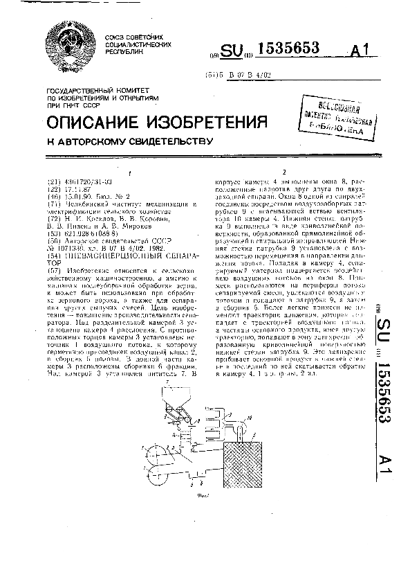 Пневмоинерционный сепаратор / Косилов Н. И., Коровин В. В., Пивень В. В., Миронов А. В.; заявитель: Челябинский институт механизации и электрификации сельского хозяйства // Описания изобретений (ретрофонд) / Комитет по патентам и товарным знакам России. – М., 2003. – 1990, № 1. — (Патенты России). — Загл. с титул. экрана. — Поисковая система: MIMOSA GTI. — Систем. требования: Acrobat Reader. — Режим доступа: ftp://smolensklib.ru/bd/patent_ru/pt1535653.pdf. — <URL:ftp://smolensklib.ru/bd/patent_ru/pt1535653.pdf>.
