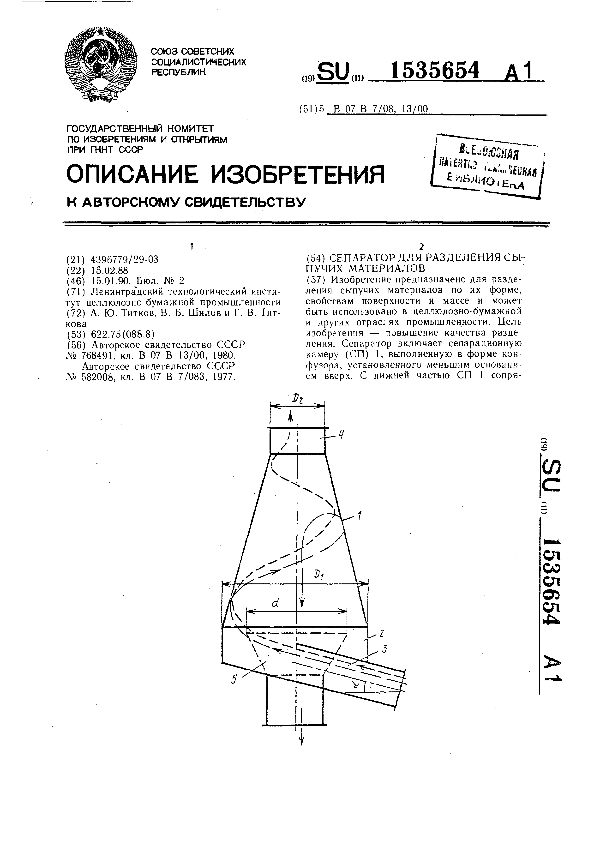 Сепаратор для разделения сыпучих материалов / Титков А. Ю., Шилов В. Б., Титкова Г. В.; заявитель: Ленинградский технологический институт целлюлозно-бумажной промышленности // Описания изобретений (ретрофонд) / Комитет по патентам и товарным знакам России. – М., 2003. – 1990, № 1. — (Патенты России). — Загл. с титул. экрана. — Поисковая система: MIMOSA GTI. — Систем. требования: Acrobat Reader. — Режим доступа: ftp://smolensklib.ru/bd/patent_ru/pt1535654.pdf. — <URL:ftp://smolensklib.ru/bd/patent_ru/pt1535654.pdf>.