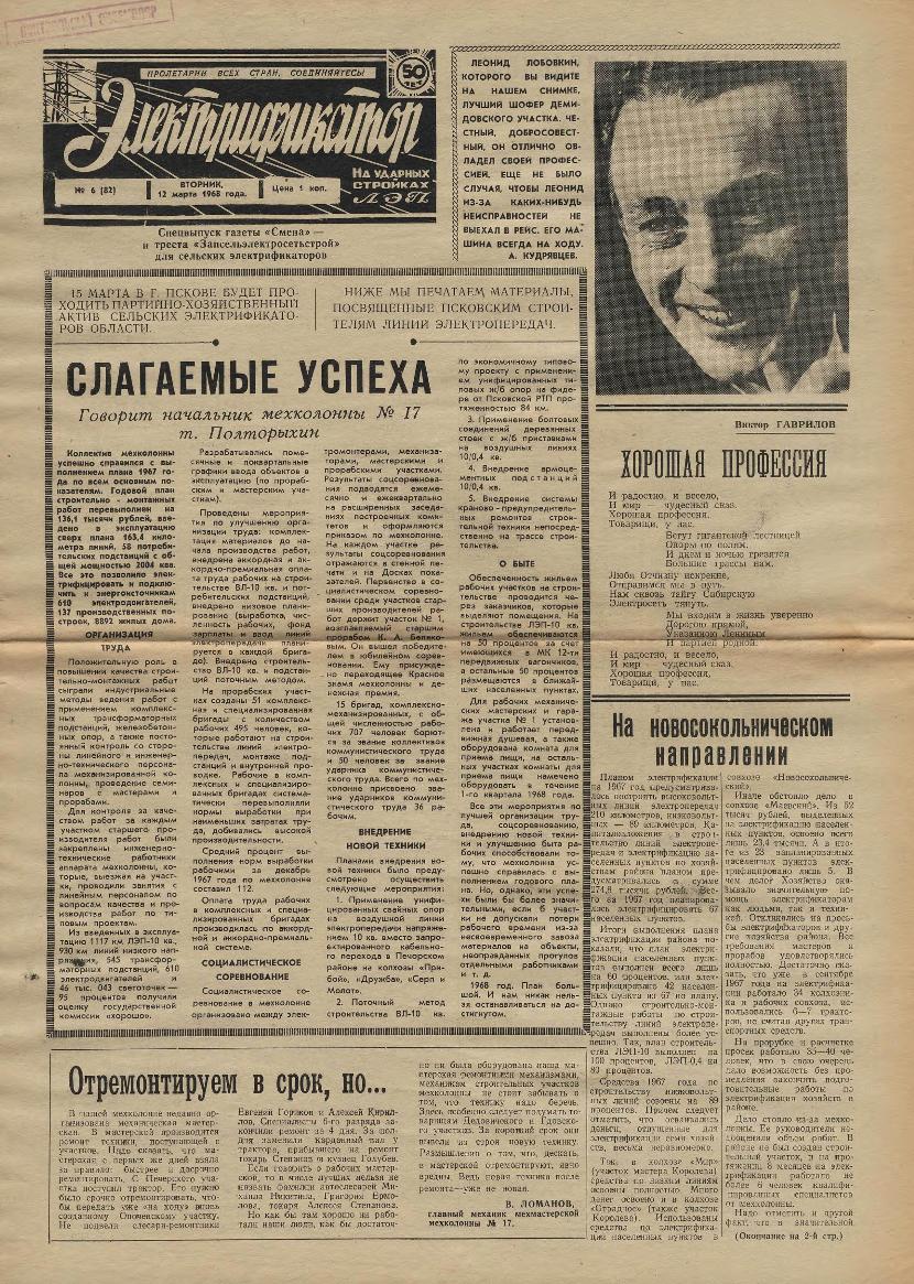 Электрификатор: Спецвыпуск газеты "Смена" - и треста "Запсельэлектросетьстрой" для сельских электрификаторов. — Смоленск: Тип. им. Смирнова, 1965-____. № 6.