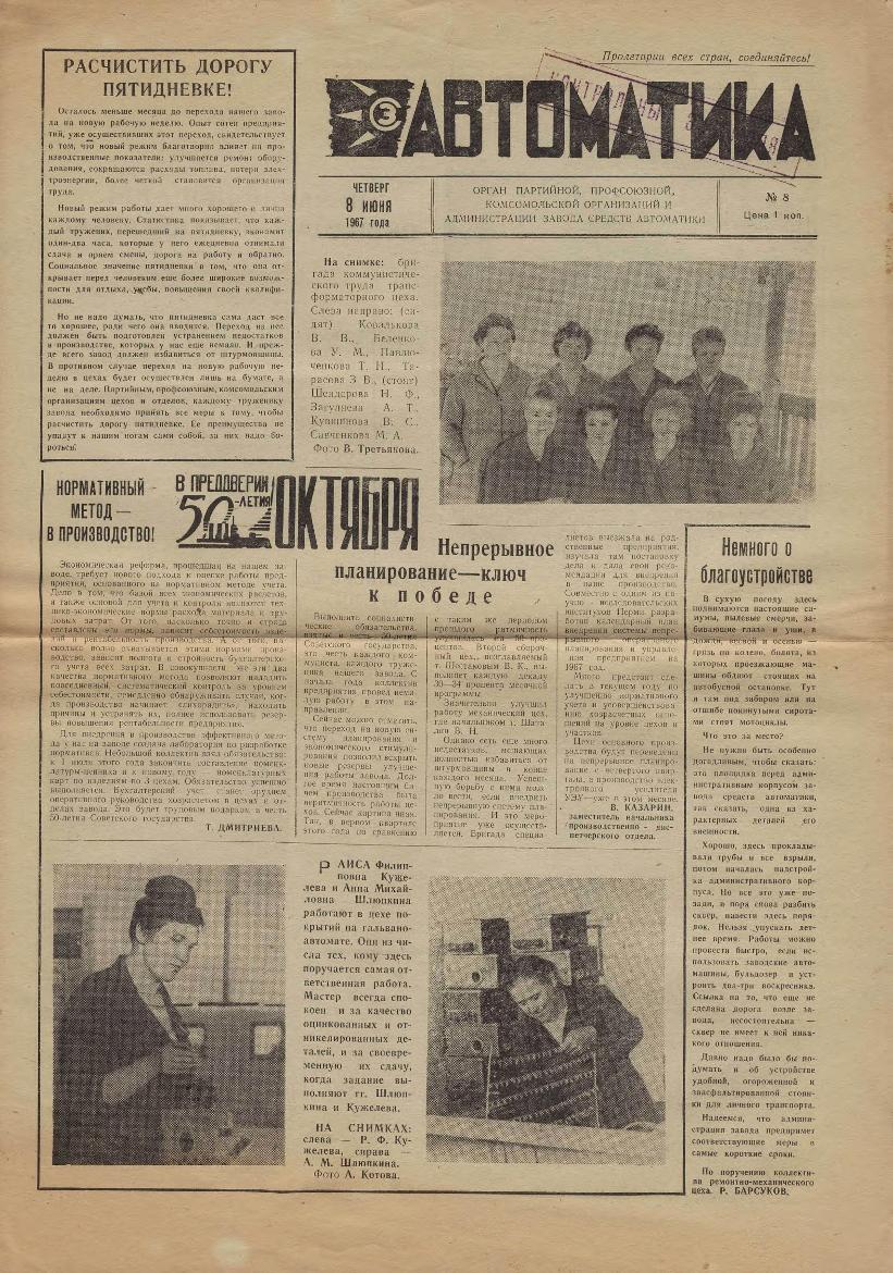 | 370 | Автоматика: Орган партийной, профсоюзной, комсомольской организаций и администрации завода. — Смоленск: Смолгортип., 1967-____. № 8.
