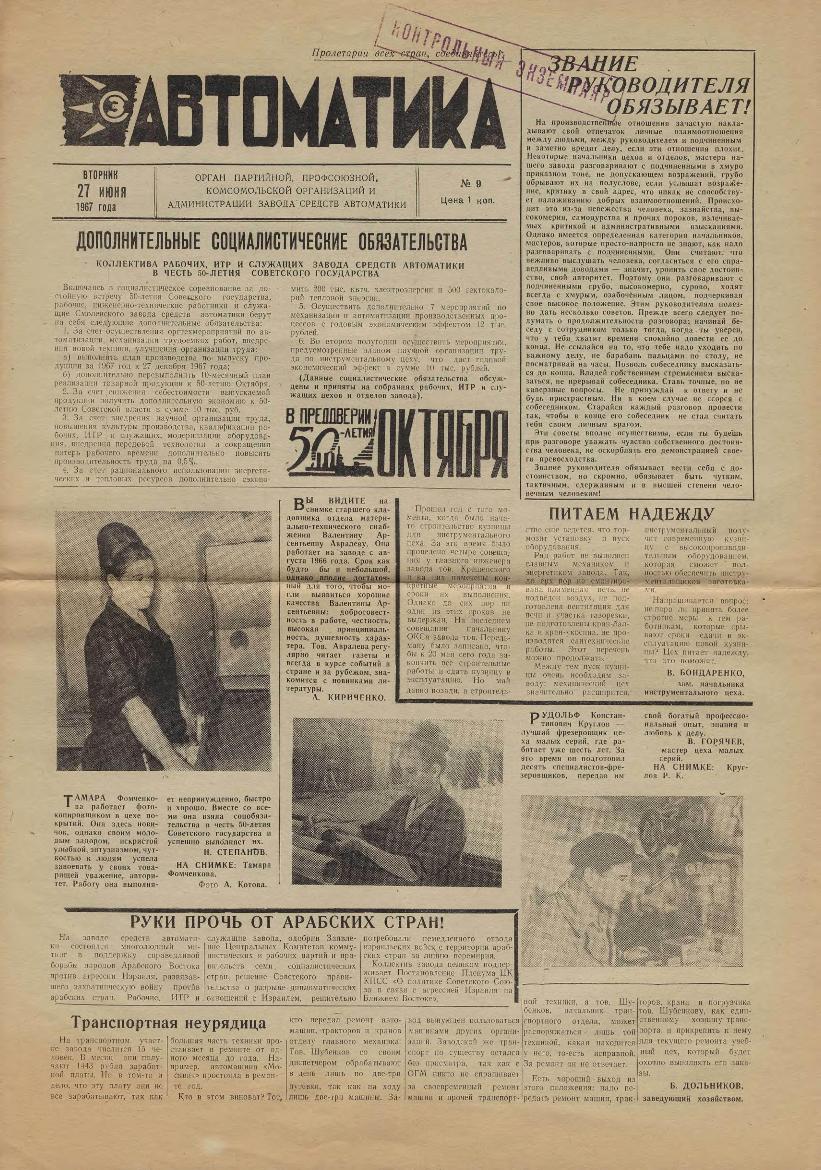 | 369 | Автоматика: Орган партийной, профсоюзной, комсомольской организаций и администрации завода. — Смоленск: Смолгортип., 1967-____. № 9.