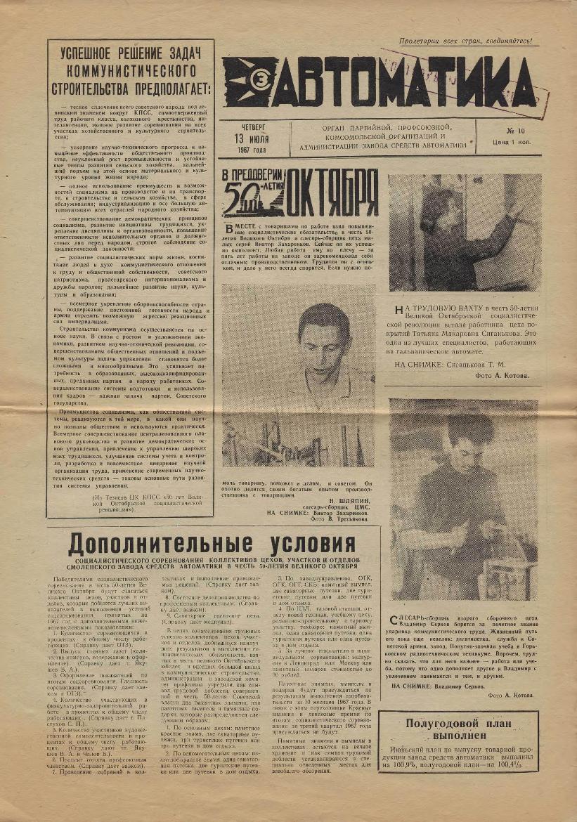 | 368 | Автоматика: Орган партийной, профсоюзной, комсомольской организаций и администрации завода. — Смоленск: Смолгортип., 1967-____. № 10.