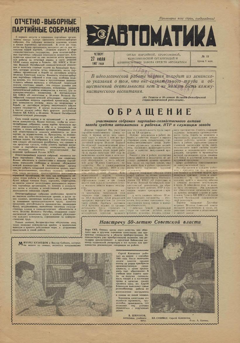 | 367 | Автоматика: Орган партийной, профсоюзной, комсомольской организаций и администрации завода. — Смоленск: Смолгортип., 1967-____. № 11.