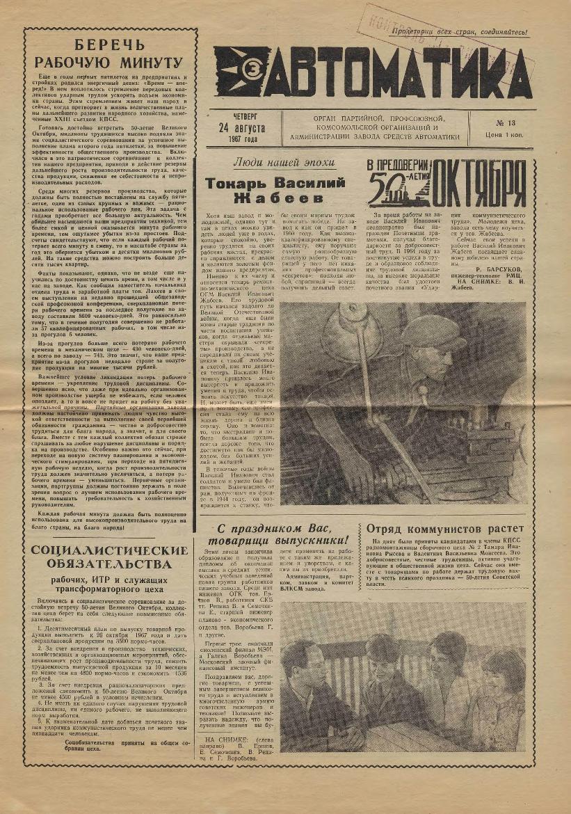 | 365 | Автоматика: Орган партийной, профсоюзной, комсомольской организаций и администрации завода. — Смоленск: Смолгортип., 1967-____. № 13.