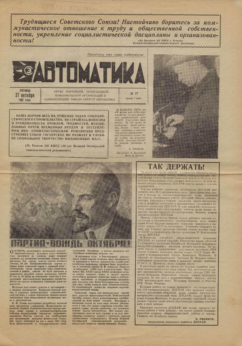 | 363 | Автоматика: Орган партийной, профсоюзной, комсомольской организаций и администрации завода. — Смоленск: Смолгортип., 1967-____. № 17.