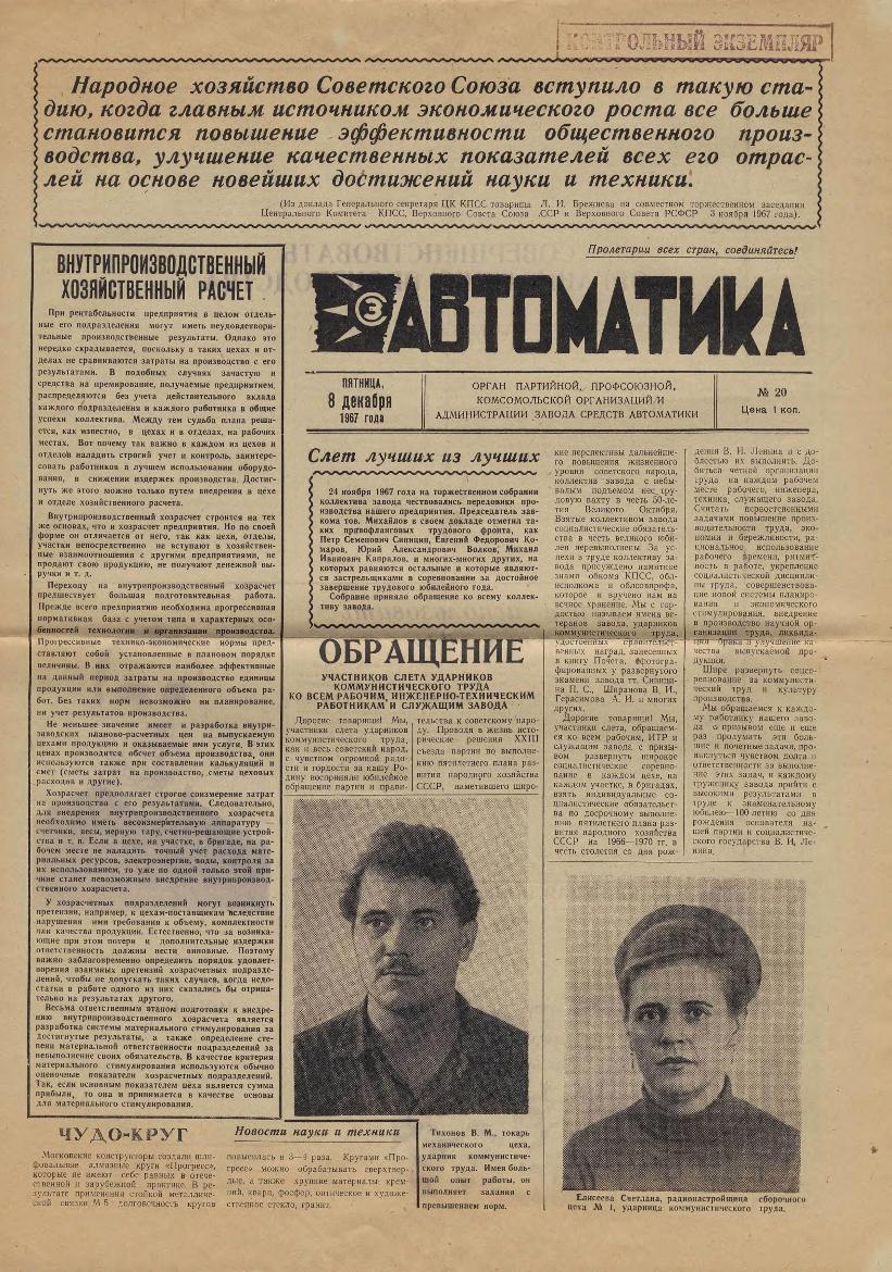 | 362 | Автоматика: Орган партийной, профсоюзной, комсомольской организаций и администрации завода. — Смоленск: Смолгортип., 1967-____. № 20.