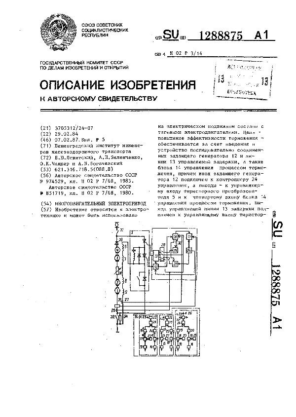 Многодвигательный электропривод / Левитский Б. Ю., Зеленченко А. П., Чандер О. К., Богачевский А. Н.; заявитель: Ленинградский институт инженеров железнодорожного транспорта // Описания изобретений (ретрофонд) / Комитет по патентам и товарным знакам России. – М., 2003. – 1987, № 1. — (Патенты России). — Загл. с титул. экрана. — Систем. требования: Acrobat Reader. — Режим доступа: http://elib.smolensklib.ru/bd/patent_ru/pt1288875.pdf. — <URL:http://elib.smolensklib.ru/bd/patent_ru/pt1288875.pdf>.