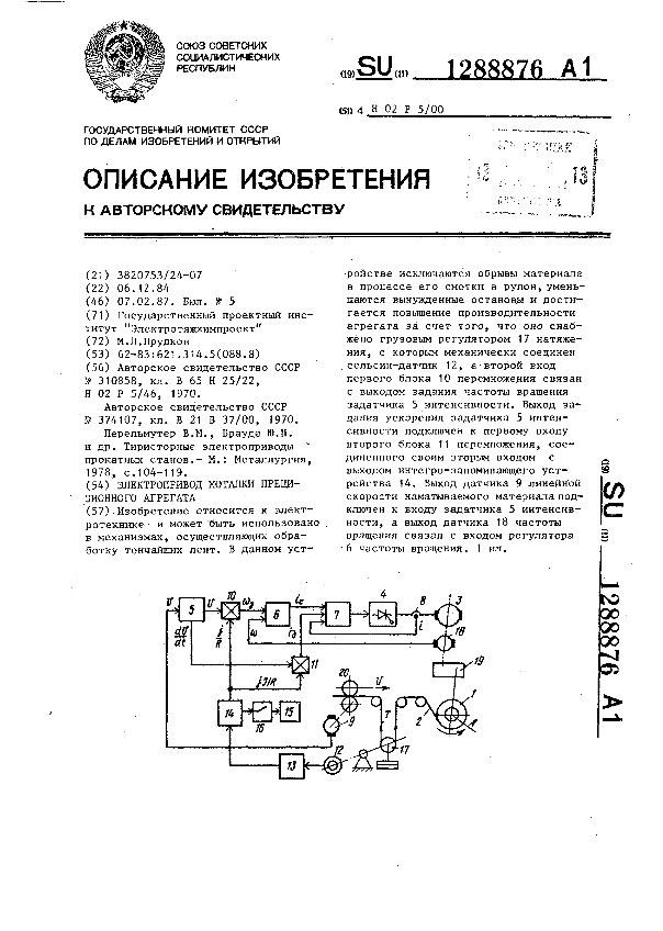 Электропривод моталки прецизионного агрегата / Прудков М. Л.; заявитель: Государственный проектный институт "Электротяжхимпроект" // Описания изобретений (ретрофонд) / Комитет по патентам и товарным знакам России. – М., 2003. – 1987, № 1. — (Патенты России). — Загл. с титул. экрана. — Систем. требования: Acrobat Reader. — Режим доступа: http://elib.smolensklib.ru/bd/patent_ru/pt1288876.pdf. — <URL:http://elib.smolensklib.ru/bd/patent_ru/pt1288876.pdf>.