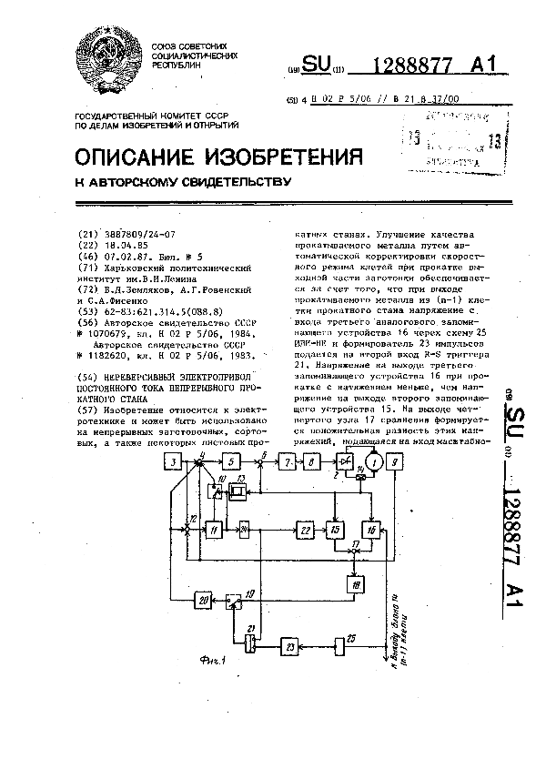 Нереверсивный электропривод постоянного тока непрерывного прокатного стана / Земляков В. Д., Ровенский А. Г., Фисенко С. А.; заявитель: Харьковский политехнический институт им. В. И. Ленина // Описания изобретений (ретрофонд) / Комитет по патентам и товарным знакам России. – М., 2003. – 1987, № 1. — (Патенты России). — Загл. с титул. экрана. — Систем. требования: Acrobat Reader. — Режим доступа: http://elib.smolensklib.ru/bd/patent_ru/pt1288877.pdf. — <URL:http://elib.smolensklib.ru/bd/patent_ru/pt1288877.pdf>.
