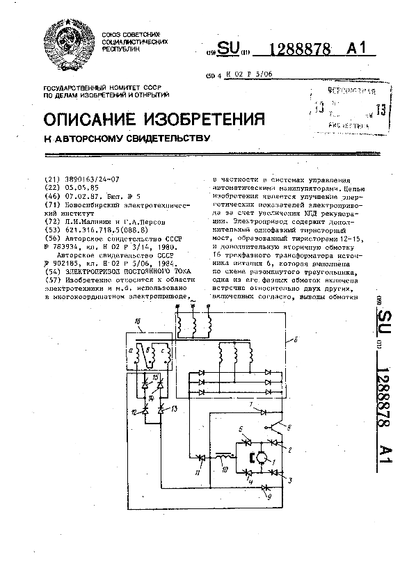 Электропривод постоянного тока / Малинин Л. И., Персов Г. А.; заявитель: Новосибирский электротехнический институт // Описания изобретений (ретрофонд) / Комитет по патентам и товарным знакам России. – М., 2003. – 1987, № 1. — (Патенты России). — Загл. с титул. экрана. — Систем. требования: Acrobat Reader. — Режим доступа: http://elib.smolensklib.ru/bd/patent_ru/pt1288878.pdf. — <URL:http://elib.smolensklib.ru/bd/patent_ru/pt1288878.pdf>.