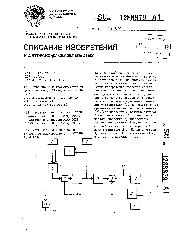 Устройство для определения параметров электропривода постоянного тока / Кадомский Н. Г., Лимонов Л. Г., Таращанский П. И.; заявитель: Украинский государственный проектный институт "Тяжпромэлектропроект" // Описания изобретений (ретрофонд) / Комитет по патентам и товарным знакам России. – М., 2003. – 1987, № 1. — (Патенты России). — Загл. с титул. экрана. — Систем. требования: Acrobat Reader. — Режим доступа: http://elib.smolensklib.ru/bd/patent_ru/pt1288879.pdf. — <URL:http://elib.smolensklib.ru/bd/patent_ru/pt1288879.pdf>.