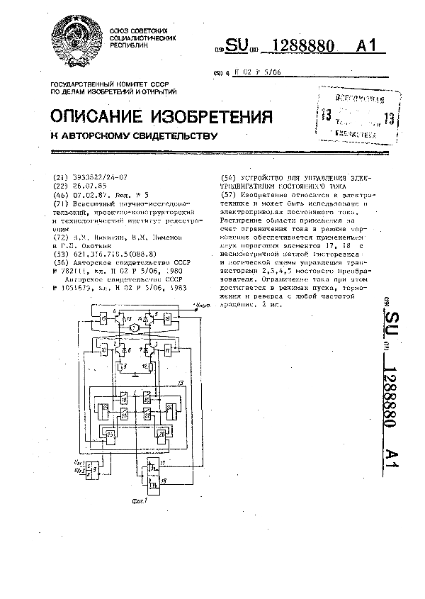 Устройство для управления электродвигателем постоянного тока / Никитин В. М., Пименов В. М., Охоткин Г. П.; заявитель: Всесоюзный научно-исследовательский, проектно-конструкторский и технологический институт релестроения // Описания изобретений (ретрофонд) / Комитет по патентам и товарным знакам России. – М., 2003. – 1987, № 1. — (Патенты России). — Загл. с титул. экрана. — Систем. требования: Acrobat Reader. — Режим доступа: http://elib.smolensklib.ru/bd/patent_ru/pt1288880.pdf. — <URL:http://elib.smolensklib.ru/bd/patent_ru/pt1288880.pdf>.