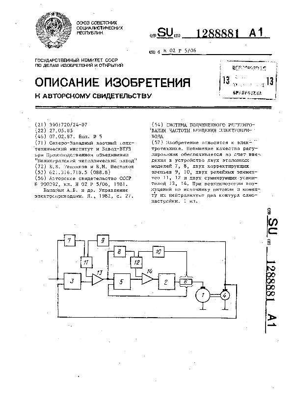 Система подчиненного регулирования частоты вращения электропривода / Тепляков Б. В., Шестаков В. М.; заявитель: Северо-Западный заочный политехнический институт, Завод-ВТУЗ при Производственном объединении "Ленинградский металлический завод" // Описания изобретений (ретрофонд) / Комитет по патентам и товарным знакам России. – М., 2003. – 1987, № 1. — (Патенты России). — Загл. с титул. экрана. — Систем. требования: Acrobat Reader. — Режим доступа: http://elib.smolensklib.ru/bd/patent_ru/pt1288881.pdf. — <URL:http://elib.smolensklib.ru/bd/patent_ru/pt1288881.pdf>.
