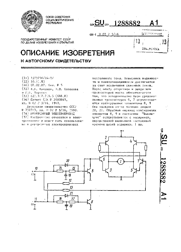 Реверсивный электропривод / Пахомов В. П., Соколова Н. И., Тарасов Г. П. // Описания изобретений (ретрофонд) / Комитет по патентам и товарным знакам России. – М., 2003. – 1987, № 1. — (Патенты России). — Загл. с титул. экрана. — Систем. требования: Acrobat Reader. — Режим доступа: http://elib.smolensklib.ru/bd/patent_ru/pt1288882.pdf. — <URL:http://elib.smolensklib.ru/bd/patent_ru/pt1288882.pdf>.
