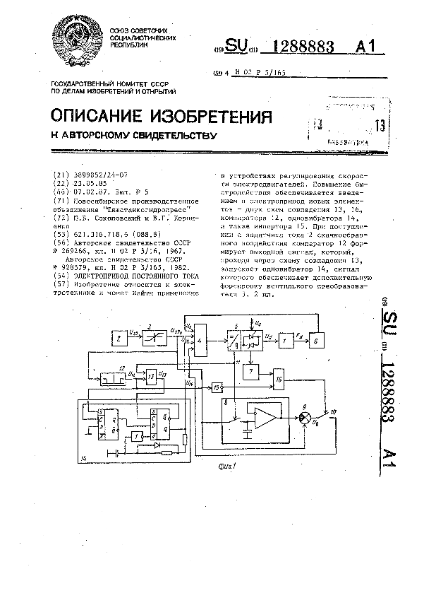 Электропривод постоянного тока / Соколовский Ю. Б., Корниенко В. Г.; заявитель: Новосибирское производственное объединение "Тяжстанкогидропресс" // Описания изобретений (ретрофонд) / Комитет по патентам и товарным знакам России. – М., 2003. – 1987, № 1. — (Патенты России). — Загл. с титул. экрана. — Систем. требования: Acrobat Reader. — Режим доступа: http://elib.smolensklib.ru/bd/patent_ru/pt1288883.pdf. — <URL:http://elib.smolensklib.ru/bd/patent_ru/pt1288883.pdf>.