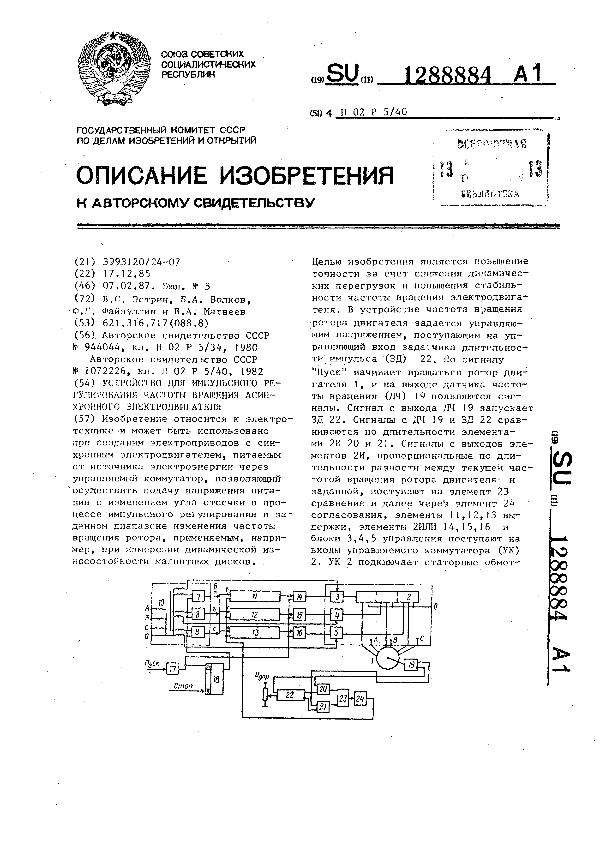 Устройство для импульсного регулирования частоты вращения асинхронного электродвигателя / Эстрин В. С., Волков Б. А., Файзуллин Ф. Г., Матвеев В. А. // Описания изобретений (ретрофонд) / Комитет по патентам и товарным знакам России. – М., 2003. – 1987, № 1. — (Патенты России). — Загл. с титул. экрана. — Систем. требования: Acrobat Reader. — Режим доступа: http://elib.smolensklib.ru/bd/patent_ru/pt1288884.pdf. — <URL:http://elib.smolensklib.ru/bd/patent_ru/pt1288884.pdf>.