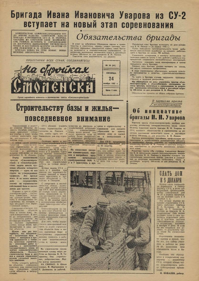На стройках Смоленска: Орган партийного комитета и руководства треста "Смоленскпромстрой". — Смоленск: Тип. им. Смирнова, 1965-____. № 20.