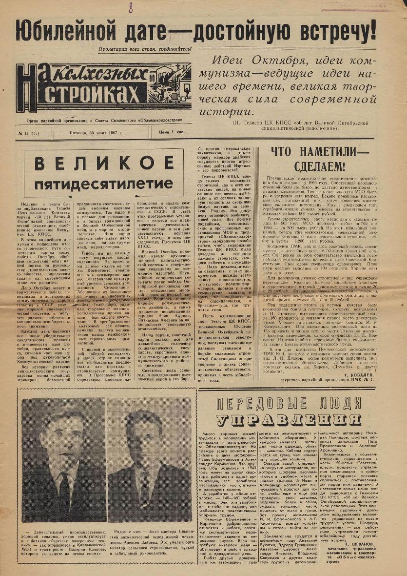 На колхозных стройках: Орган партийной организации и Совета Смоленского "Облмежколхозстроя". — Смоленск: Тип. им. Смирнова, 1965-____. № 15.
