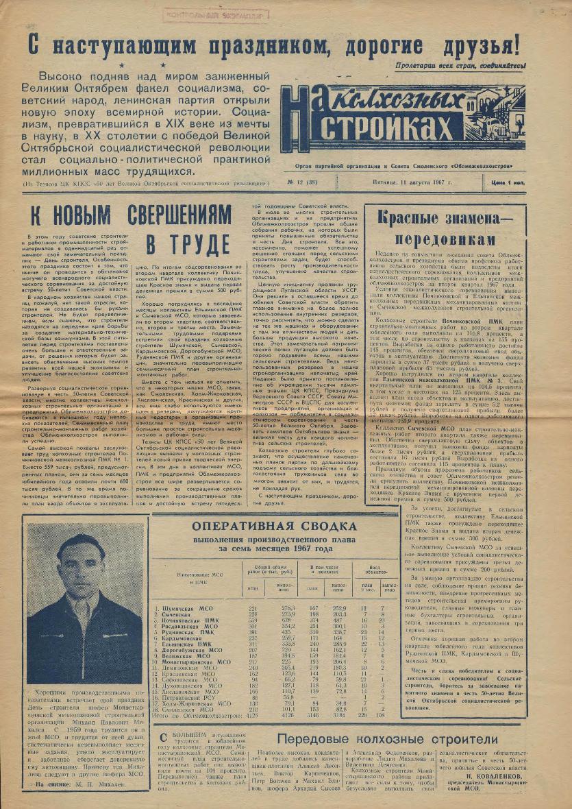 На колхозных стройках: Орган партийной организации и Совета Смоленского "Облмежколхозстроя". — Смоленск: Тип. им. Смирнова, 1965-____. № 12.