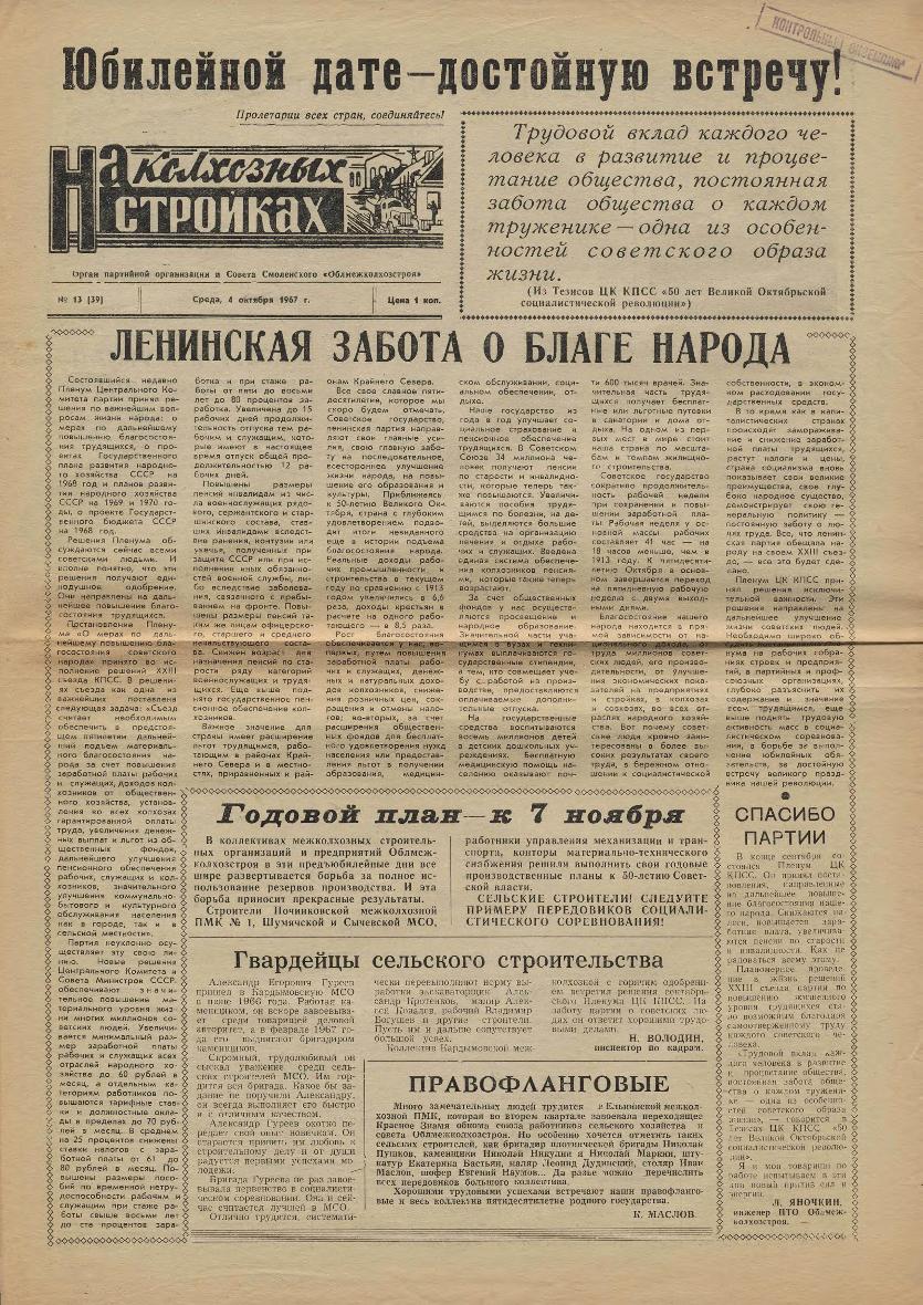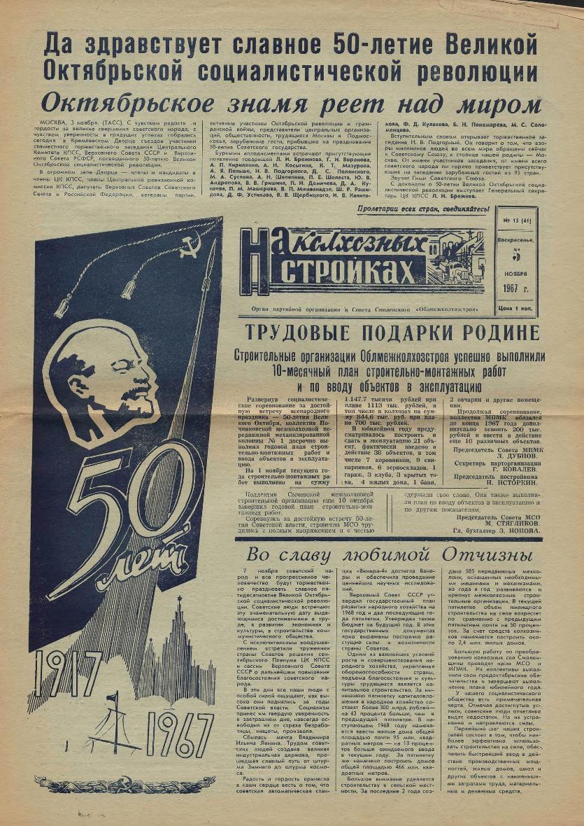 На колхозных стройках: Орган партийной организации и Совета Смоленского "Облмежколхозстроя". — Смоленск: Тип. им. Смирнова, 1965-____. № 13.