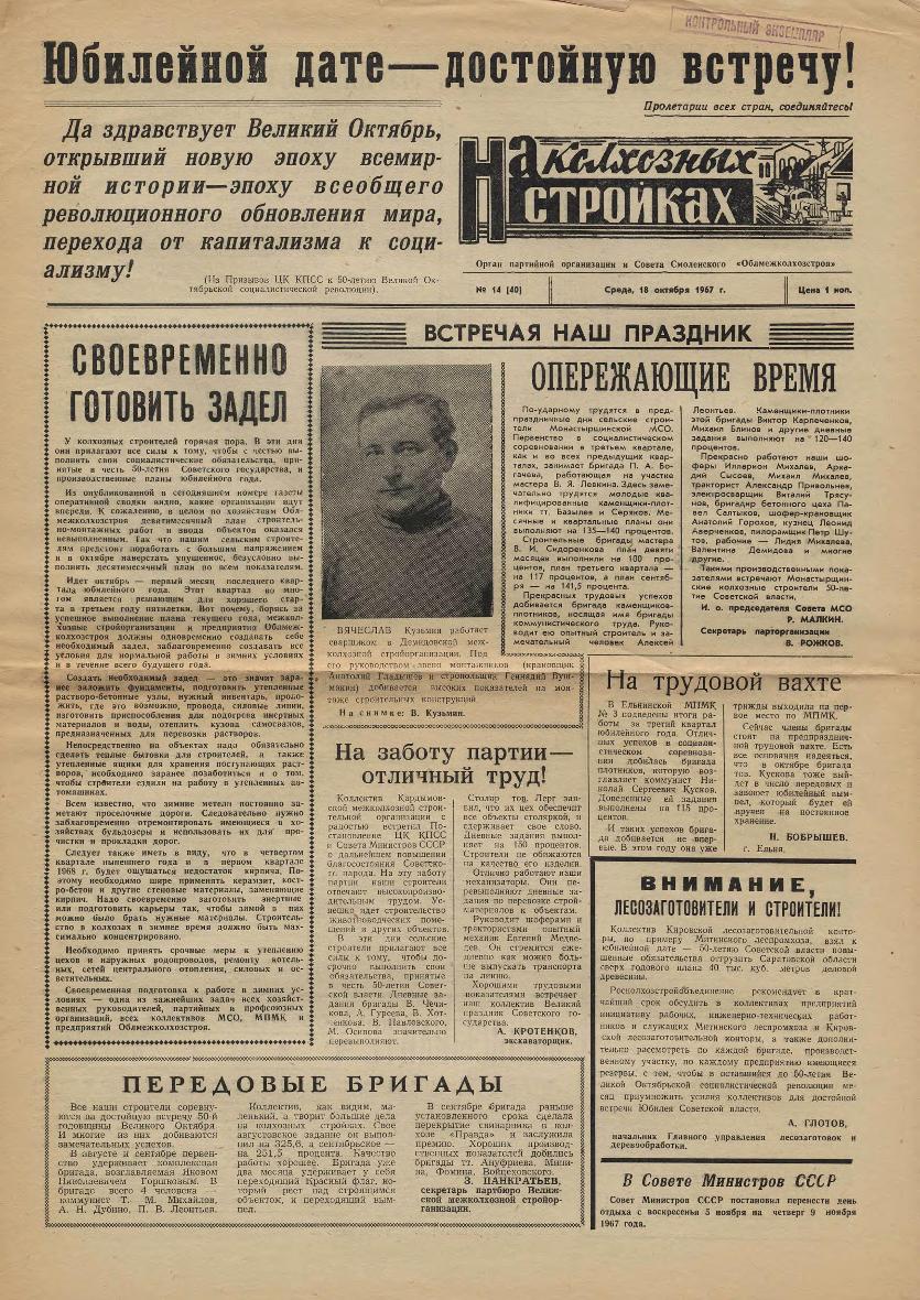 На колхозных стройках: Орган партийной организации и Совета Смоленского "Облмежколхозстроя". — Смоленск: Тип. им. Смирнова, 1965-____. № 14.