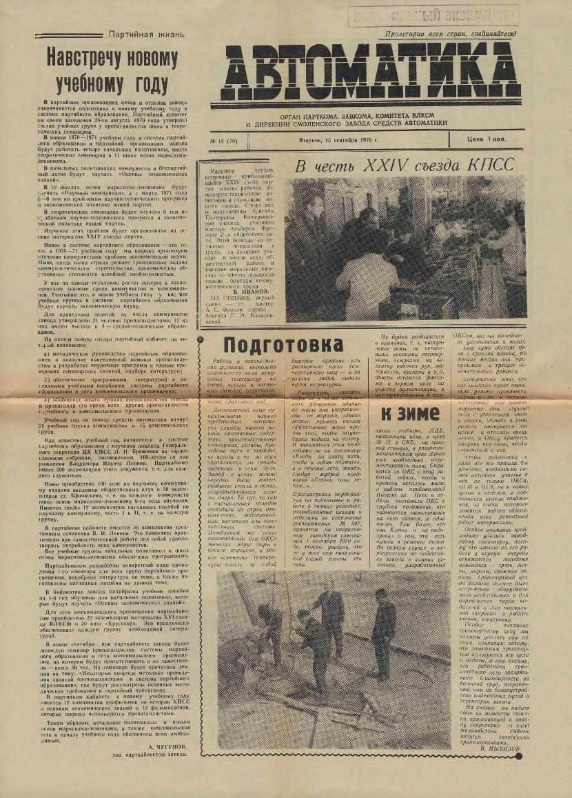 Автоматика: Орган парткома, завкома, комитета ВЛКСМ и дирекции Смоленского завода средств автоматики. — Смоленск: Смолгортип., 1967-____. № 13.