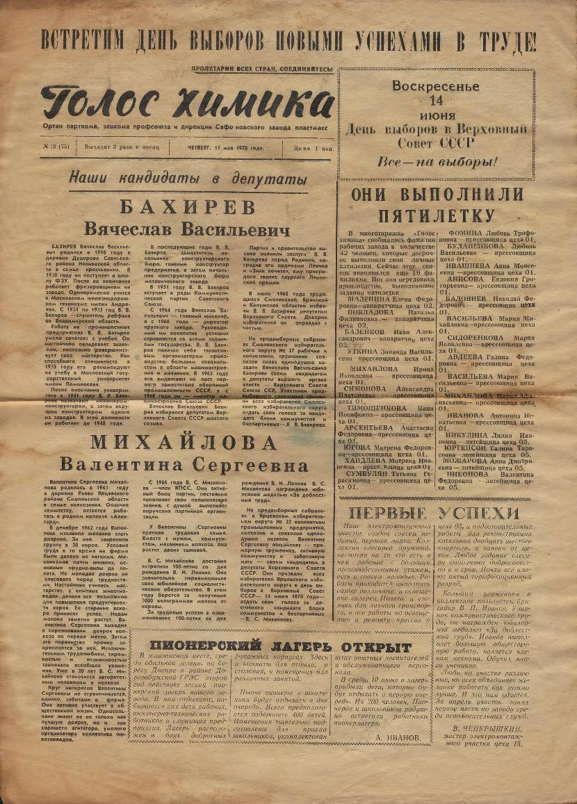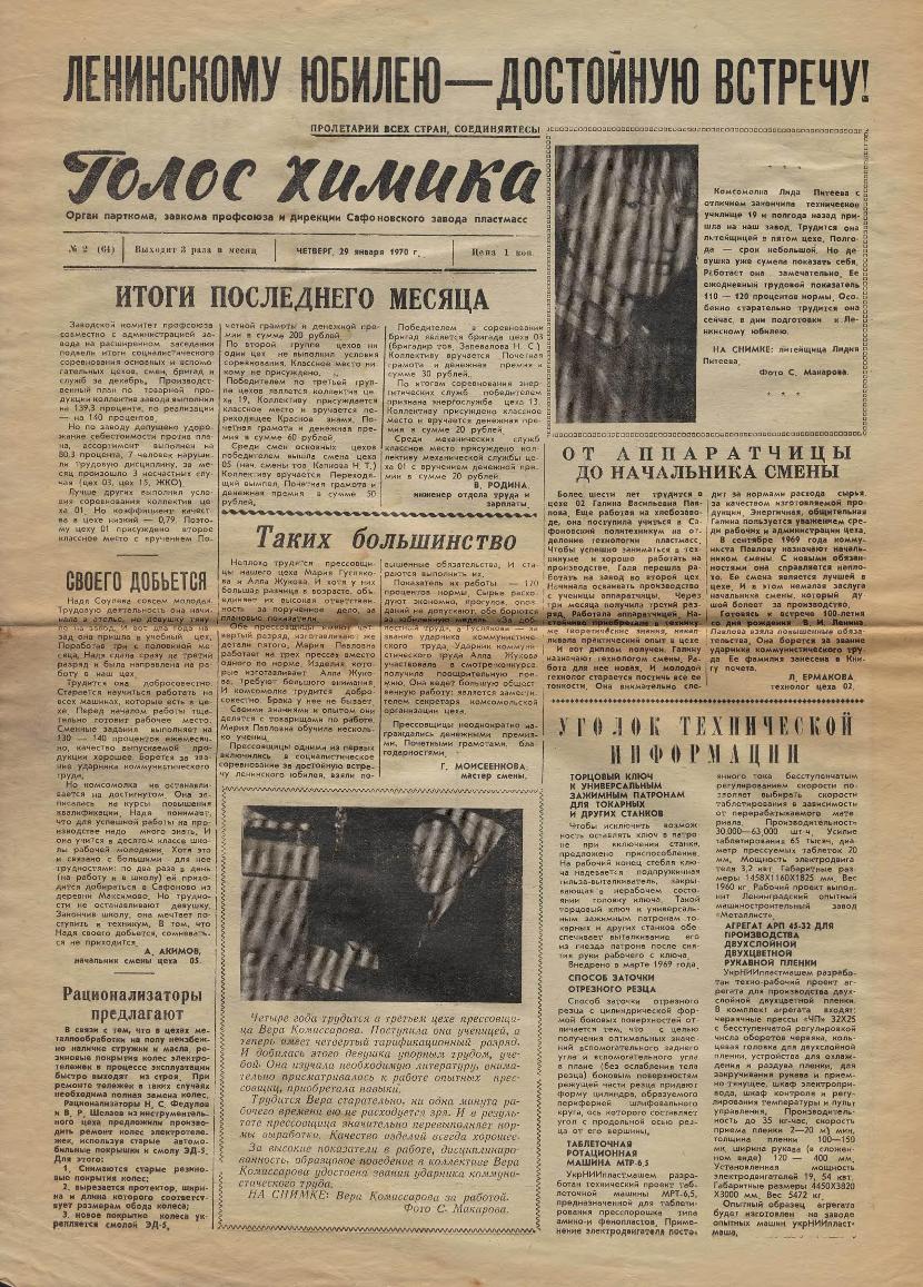 Голос химика: Орган парткома, завкома профсоюза и дирекции Сафоновского завода пластмасс. — Сафоново: Сафоновская тип. Смолоблуправ., 1966-____. № 13.