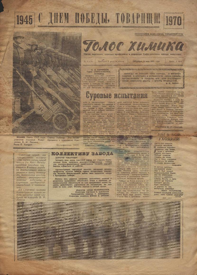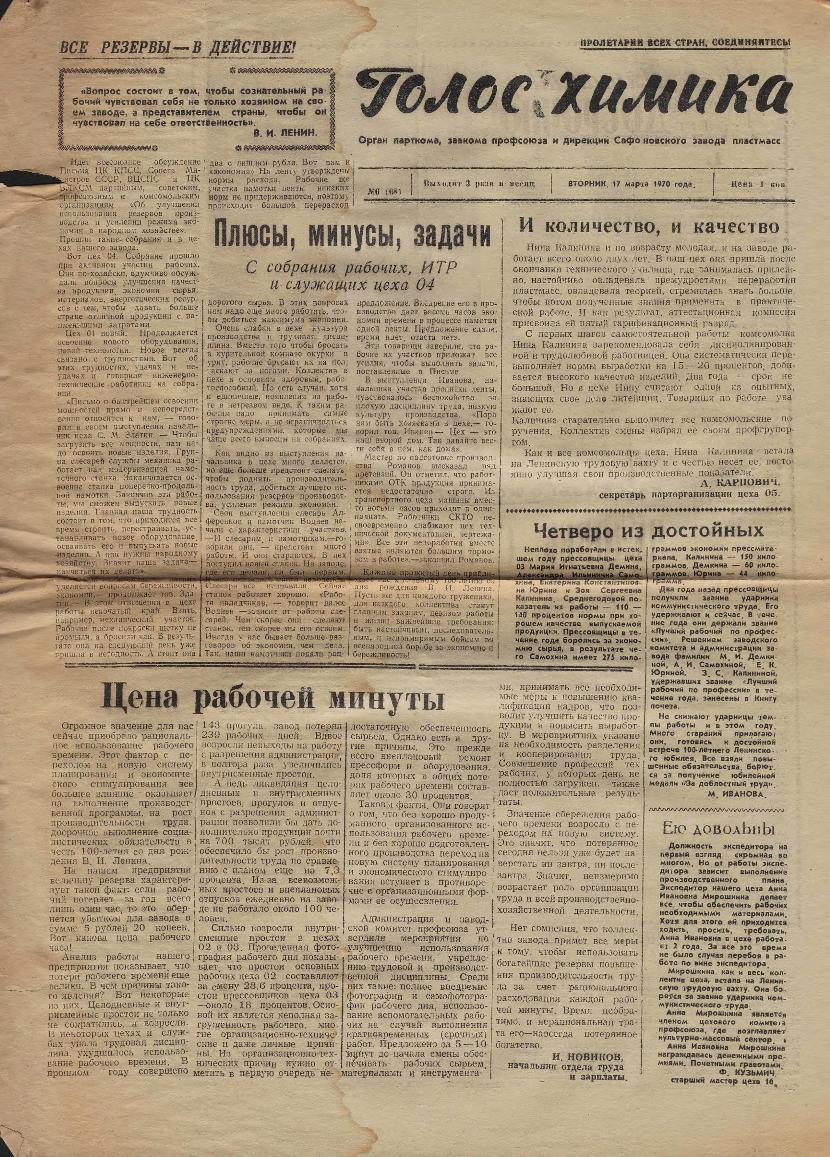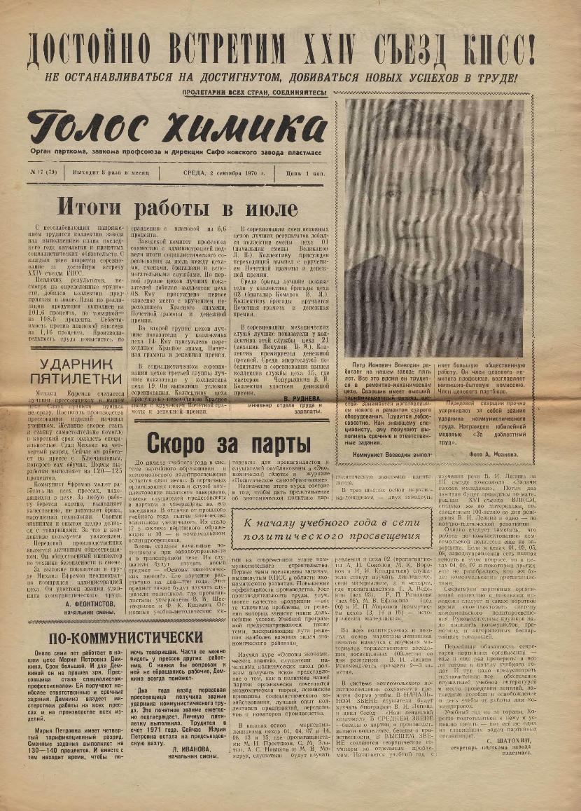 Голос химика: Орган парткома, завкома профсоюза и дирекции Сафоновского завода пластмасс. — Сафоново: Сафоновская тип. Смолоблуправ., 1966-____. № 17.