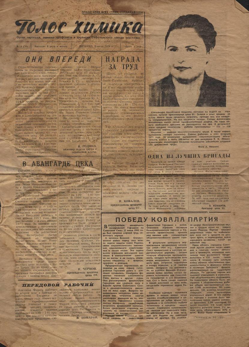 Голос химика: Орган парткома, завкома профсоюза и дирекции Сафоновского завода пластмасс. — Сафоново: Сафоновская тип. Смолоблуправ., 1966-____. № 14.