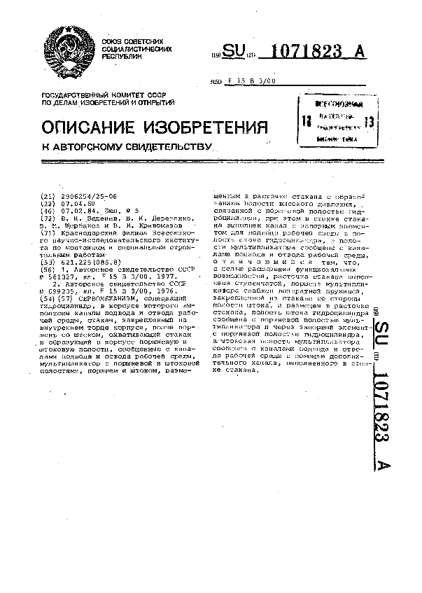 Сервомеханизм / Веденев В. И., Деревянко В. И., Щербаков В. М., Кривомаэов В. И.; заявитель: Краснодарский филиал Всесоюзного научно-исследовательского института по монтажным и специальным строительным работам // Описания изобретений (ретрофонд) / Комитет по патентам и товарным знакам России. – М. — (Патенты России)., 2003. – 1984, № 1. — Загл. с титул. экрана. — Поисковая система: ИПС MIMOSA GTI. — Систем. требования: Acrobat Reader. — Режим доступа: ftp://smolensklib.ru/bd/patent_ru/pt1071823.pdf. — <URL:ftp://smolensklib.ru/bd/patent_ru/pt1071823.pdf>.