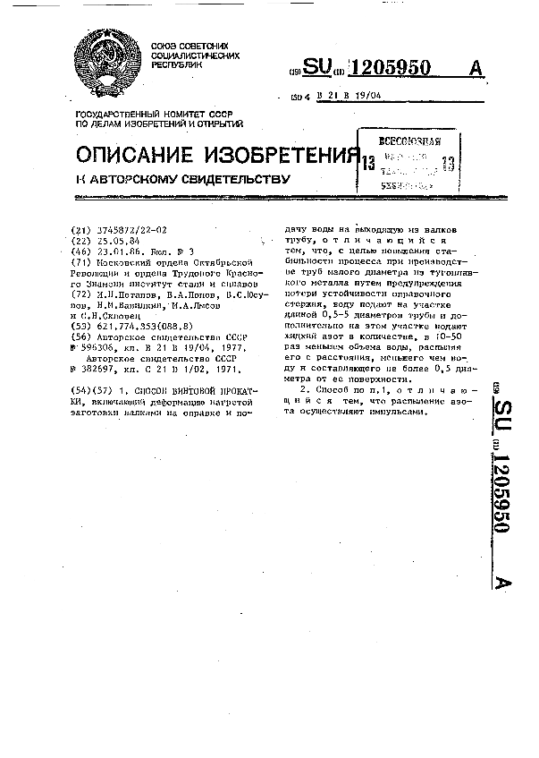 Способ винтовой прокатки / Потапов И. Н., Попов В. А., Юсупов В. С. [и др.]; заявитель: Московский ордена Октябрьской Революции и ордена Трудового Красного Знамени институт стали и сплавов // Описания изобретений (ретрофонд) / Комитет по патентам и товарным знакам России. – М., 2003. – 1986, № 1. — (Патенты России). — Загл. с титул. экрана. — Поисковая система: ИПС MIMOSA GTI. — Систем. требования: Acrobat Reader. — Режим доступа: ftp://smolensklib.ru/bd/patent_ru/pt1205950.pdf. — <URL:ftp://smolensklib.ru/bd/patent_ru/pt1205950.pdf>.