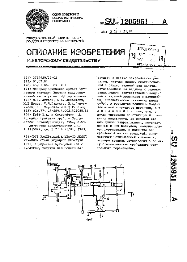 Распределительно-подающий механизм стана холодной прокатки труб / Галивец Д. В., Гамерштейн А. В., Попов М. В. [и др.]; заявитель: Днепродзержинский ордена Трудового Красного Знамени индустриальный институт им. М. И. Арсеничева // Описания изобретений (ретрофонд) / Комитет по патентам и товарным знакам России. – М., 2003. – 1986, № 1. — (Патенты России). — Загл. с титул. экрана. — Поисковая система: ИПС MIMOSA GTI. — Систем. требования: Acrobat Reader. — Режим доступа: ftp://smolensklib.ru/bd/patent_ru/pt1205951.pdf. — <URL:ftp://smolensklib.ru/bd/patent_ru/pt1205951.pdf>.