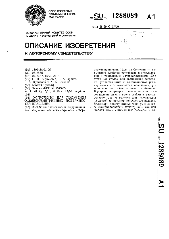 Устройство для получения осенесимметричных поверхностей вращения / Вербицкий О. П., Зубков В. А., Кузнецов Е. А., Рыдник А. А. // Описания изобретений (ретрофонд) / Комитет по патентам и товарным знакам России. – М., 2003. – 1987, № 1. — (Патенты России). — Загл. с титул. экрана. — Поисковая система: MIMOSA GTI. — Систем. требования: Acrobat Reader. — Режим доступа: ftp://smolensklib.ru/bd/patent_ru/pt1288089.pdf. — <URL:ftp://smolensklib.ru/bd/patent_ru/pt1288089.pdf>.