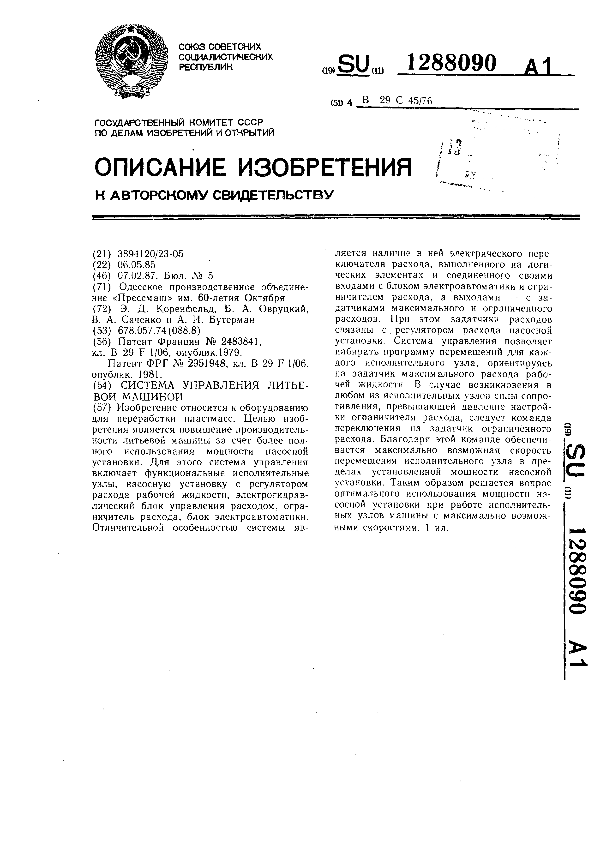 Система управления литьевой машиной / Коренфельд Э. Д., Овруцкий Б. А., Саченко В. А., Бутерман А. И.; заявитель: Одесское производственное объединение «Прессмаш» им. 60-летия Октября // Описания изобретений (ретрофонд) / Комитет по патентам и товарным знакам России. – М., 2003. – 1987, № 1. — (Патенты России). — Загл. с титул. экрана. — Поисковая система: MIMOSA GTI. — Систем. требования: Acrobat Reader. — Режим доступа: ftp://smolensklib.ru/bd/patent_ru/pt1288090.pdf. — <URL:ftp://smolensklib.ru/bd/patent_ru/pt1288090.pdf>.