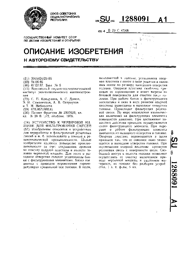 Устройство к червячной машине для фильтрования смесей / Кондраков С. П., Дамов А. С., Симаненков Э. И. [и др.]; заявитель: Всесоюзный научно-исследовательский институт резинотехнического машиностроения // Описания изобретений (ретрофонд) / Комитет по патентам и товарным знакам России. – М., 2003. – 1987, № 1. — (Патенты России). — Загл. с титул. экрана. — Поисковая система: MIMOSA GTI. — Систем. требования: Acrobat Reader. — Режим доступа: ftp://smolensklib.ru/bd/patent_ru/pt1288091.pdf. — <URL:ftp://smolensklib.ru/bd/patent_ru/pt1288091.pdf>.
