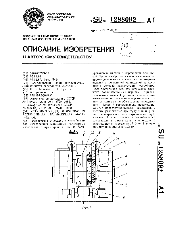Устройство для формования вспененных полимерных материалов / Болотов В. Е., Трошин Е. Г., Грищенко В. А.; заявитель: Свердловский научно-исследовательский институт переработки древесины // Описания изобретений (ретрофонд) / Комитет по патентам и товарным знакам России. – М., 2003. – 1987, № 1. — (Патенты России). — Загл. с титул. экрана. — Поисковая система: MIMOSA GTI. — Систем. требования: Acrobat Reader. — Режим доступа: ftp://smolensklib.ru/bd/patent_ru/pt1288092.pdf. — <URL:ftp://smolensklib.ru/bd/patent_ru/pt1288092.pdf>.