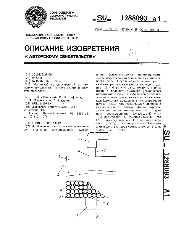 Пеногенератор / Левинский Б. В., Сафонов В. Ф., Мареев В. Я., Медунин А. А.; заявитель: Иркутский государственный научно-исследовательский институт редких и цветных металлов // Описания изобретений (ретрофонд) / Комитет по патентам и товарным знакам России. – М., 2003. – 1987, № 1. — (Патенты России). — Загл. с титул. экрана. — Поисковая система: MIMOSA GTI. — Систем. требования: Acrobat Reader. — Режим доступа: ftp://smolensklib.ru/bd/patent_ru/pt1288093.pdf. — <URL:ftp://smolensklib.ru/bd/patent_ru/pt1288093.pdf>.