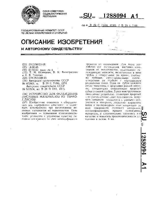 Устройство для охлаждения листовых материалов из термопластов / Новицкая Т. М., Виноградова В. К., Толочко А. В. // Описания изобретений (ретрофонд) / Комитет по патентам и товарным знакам России. – М., 2003. – 1987, № 1. — (Патенты России). — Загл. с титул. экрана. — Поисковая система: MIMOSA GTI. — Систем. требования: Acrobat Reader. — Режим доступа: ftp://smolensklib.ru/bd/patent_ru/pt1288094.pdf. — <URL:ftp://smolensklib.ru/bd/patent_ru/pt1288094.pdf>.