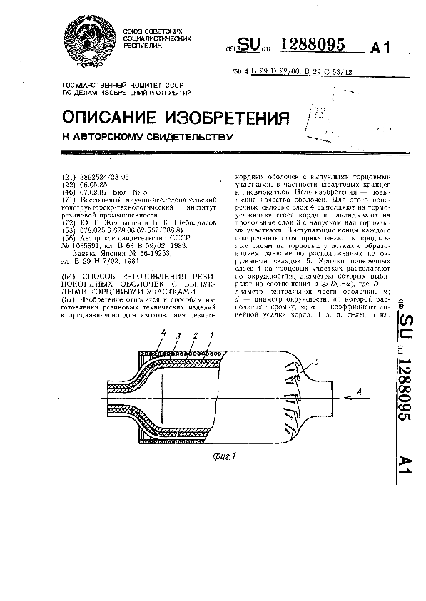 Способ изготовления резинокордных оболочек с выпуклыми торцовыми участками / Желтышев Ю. Г., Шеболдасов В. К.; заявитель: Всесоюзный научно-исследовательский конструкторско-технологический институт резиновой промышленности // Описания изобретений (ретрофонд) / Комитет по патентам и товарным знакам России. – М., 2003. – 1987, № 1. — (Патенты России). — Загл. с титул. экрана. — Поисковая система: MIMOSA GTI. — Систем. требования: Acrobat Reader. — Режим доступа: ftp://smolensklib.ru/bd/patent_ru/pt1288095.pdf. — <URL:ftp://smolensklib.ru/bd/patent_ru/pt1288095.pdf>.