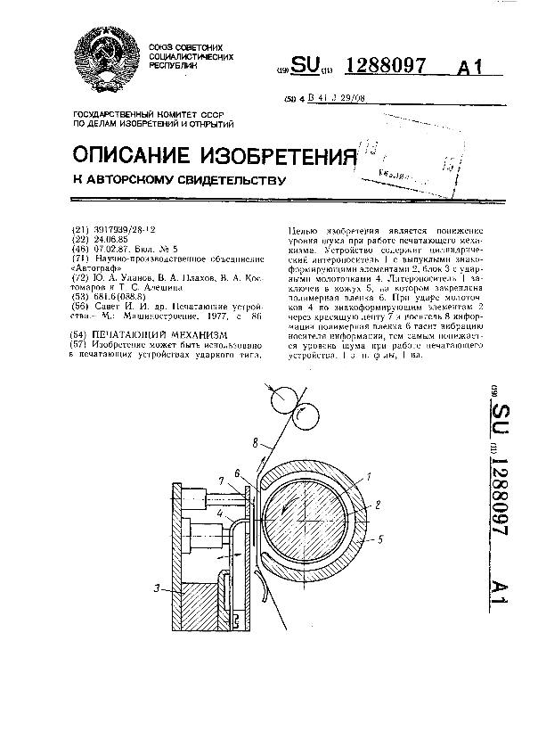 Печатающий механизм / Уланов Ю. А., Плахов В. А., Костомаров В. А., Алешина Т. С.; заявитель: Научно-производственное объединение «Автограф» // Описания изобретений (ретрофонд) / Комитет по патентам и товарным знакам России. – М., 2003. – 1987, № 1. — (Патенты России). — Загл. с титул. экрана. — Поисковая система: MIMOSA GTI. — Систем. требования: Acrobat Reader. — Режим доступа: ftp://smolensklib.ru/bd/patent_ru/pt1288097.pdf. — <URL:ftp://smolensklib.ru/bd/patent_ru/pt1288097.pdf>.