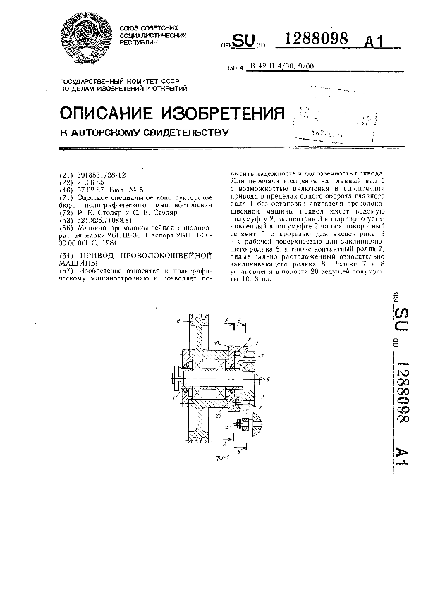 Привод проволокошвейной машины / Столяр Р. Е., Столяр С. Е.; заявитель: Одесское специальное конструкторское бюро полиграфического машиностроения // Описания изобретений (ретрофонд) / Комитет по патентам и товарным знакам России. – М., 2003. – 1987, № 1. — (Патенты России). — Загл. с титул. экрана. — Поисковая система: MIMOSA GTI. — Систем. требования: Acrobat Reader. — Режим доступа: ftp://smolensklib.ru/bd/patent_ru/pt1288098.pdf. — <URL:ftp://smolensklib.ru/bd/patent_ru/pt1288098.pdf>.