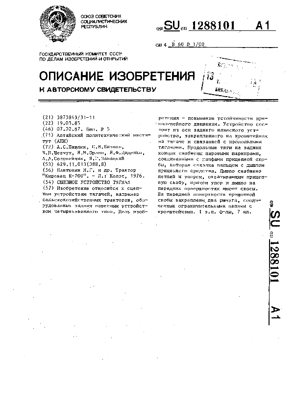 Сцепное устройство тягача / Павлюк А. С., Бизяев С. Н., Шевчук В. П. [и др.]; заявитель: Алтайский политехнический институт // Описания изобретений (ретрофонд) / Комитет по патентам и товарным знакам России. – М., 2003. – 1987, № 1. — (Патенты России). — Загл. с титул. экрана. — Поисковая система: MIMOSA GTI. — Систем. требования: Acrobat Reader. — Режим доступа: ftp://smolensklib.ru/bd/patent_ru/pt1288101.pdf. — <URL:ftp://smolensklib.ru/bd/patent_ru/pt1288101.pdf>.