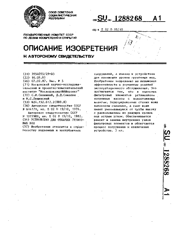 Устройство для откачки грунтовых вод / Синицкий С. И., Соколин Д. Д., Лещинский М. С.; заявитель: Московский научно-исследовательский и проектно-изыскательский институт "МосводоканалНИИпроект" // Описания изобретений (ретрофонд) / Комитет по патентам и товарным знакам России. – М., 2003. – 1987, № 1. — (Патенты России). — Загл. с титул. экрана. — Поисковая система: MIMOSA GTI. — Систем. требования: Acrobat Reader. — Режим доступа: ftp://smolensklib.ru/bd/patent_ru/pt1288268.pdf. — <URL:ftp://smolensklib.ru/bd/patent_ru/pt1288268.pdf>.