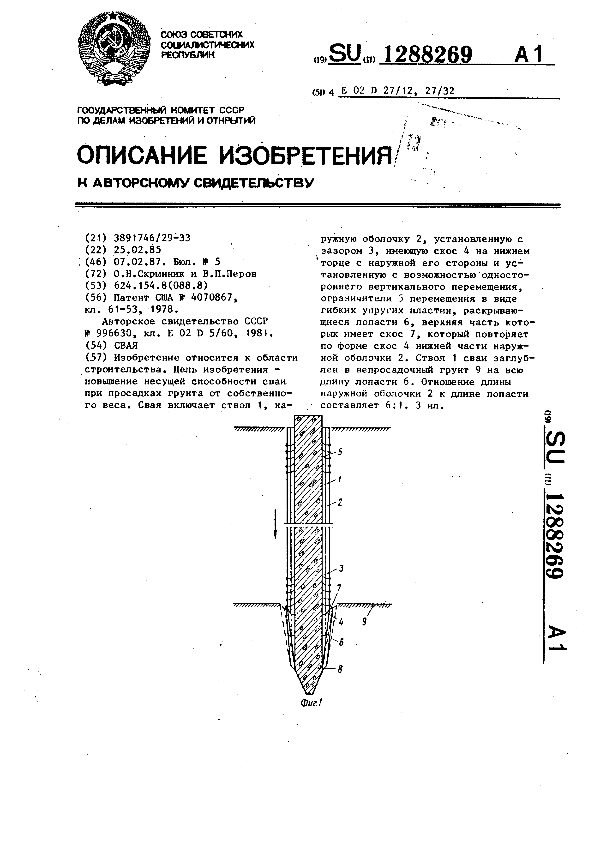 Свая / Скрынник О. Н., Перов В. П. // Описания изобретений (ретрофонд) / Комитет по патентам и товарным знакам России. – М., 2003. – 1987, № 1. — (Патенты России). — Загл. с титул. экрана. — Поисковая система: MIMOSA GTI. — Систем. требования: Acrobat Reader. — Режим доступа: ftp://smolensklib.ru/bd/patent_ru/pt1288269.pdf. — <URL:ftp://smolensklib.ru/bd/patent_ru/pt1288269.pdf>.