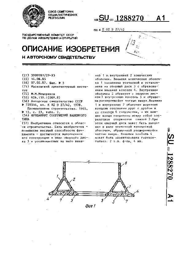Фундамент сооружений башенного типа / Мещеряков Ю. М.; заявитель: Московский архитектурный институт // Описания изобретений (ретрофонд) / Комитет по патентам и товарным знакам России. – М., 2003. – 1987, № 1. — (Патенты России). — Загл. с титул. экрана. — Поисковая система: MIMOSA GTI. — Систем. требования: Acrobat Reader. — Режим доступа: ftp://smolensklib.ru/bd/patent_ru/pt1288270.pdf. — <URL:ftp://smolensklib.ru/bd/patent_ru/pt1288270.pdf>.