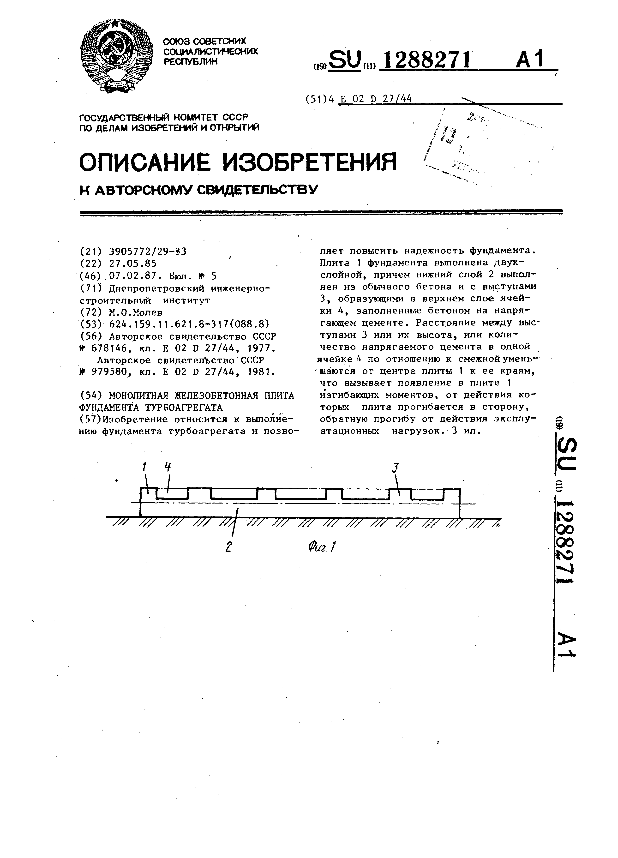 Монолитная железобетонная плита фундамента турбоагрегата / Молев М. О.; заявитель: Днепропетровский инженерно-строительный институт // Описания изобретений (ретрофонд) / Комитет по патентам и товарным знакам России. – М., 2003. – 1987, № 1. — (Патенты России). — Загл. с титул. экрана. — Поисковая система: MIMOSA GTI. — Систем. требования: Acrobat Reader. — Режим доступа: ftp://smolensklib.ru/bd/patent_ru/pt1288271.pdf. — <URL:ftp://smolensklib.ru/bd/patent_ru/pt1288271.pdf>.