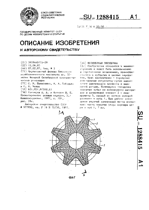 Полимерная звездочка / Пилипенко О. И., Лебудько В. А., Чежин С. П.; заявитель: Черниговский филиал Киевского политехнического института им. 50-летия Великой Октябрьской социалистической революции // Описания изобретений (ретрофонд) / Комитет по патентам и товарным знакам России. – М., 2003. – 1987, № 1. — (Патенты России). — Загл. с титул. экрана. — Поисковая система: MIMOSA GTI. — Систем. требования: Acrobat Reader. — Режим доступа: ftp://smolensklib.ru/bd/patent_ru/pt1288415.pdf. — <URL:ftp://smolensklib.ru/bd/patent_ru/pt1288415.pdf>.