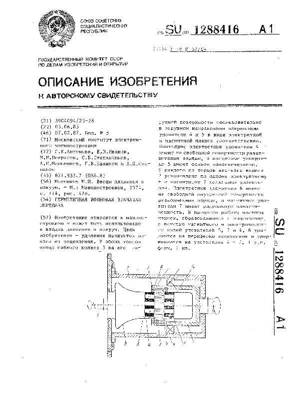Герметичная волновая зубчатая передача / Антонова Г. К., Ивашов Е. Н., Некрасов М. И. [и др.]; заявитель: Московский институт электронного машиностроения // Описания изобретений (ретрофонд) / Комитет по патентам и товарным знакам России. – М., 2003. – 1987, № 1. — (Патенты России). — Загл. с титул. экрана. — Поисковая система: MIMOSA GTI. — Систем. требования: Acrobat Reader. — Режим доступа: ftp://smolensklib.ru/bd/patent_ru/pt1288416.pdf. — <URL:ftp://smolensklib.ru/bd/patent_ru/pt1288416.pdf>.