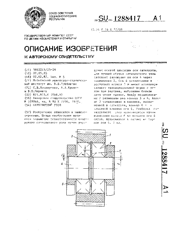 Сателлитный узел / Бондаренко С. В., Крылов А. А., Чириков В. Н.; заявитель: Московский инженерно-строительный институт им. В. В. Куйбышева // Описания изобретений (ретрофонд) / Комитет по патентам и товарным знакам России. – М., 2003. – 1987, № 1. — (Патенты России). — Загл. с титул. экрана. — Поисковая система: MIMOSA GTI. — Систем. требования: Acrobat Reader. — Режим доступа: ftp://smolensklib.ru/bd/patent_ru/pt1288417.pdf. — <URL:ftp://smolensklib.ru/bd/patent_ru/pt1288417.pdf>.